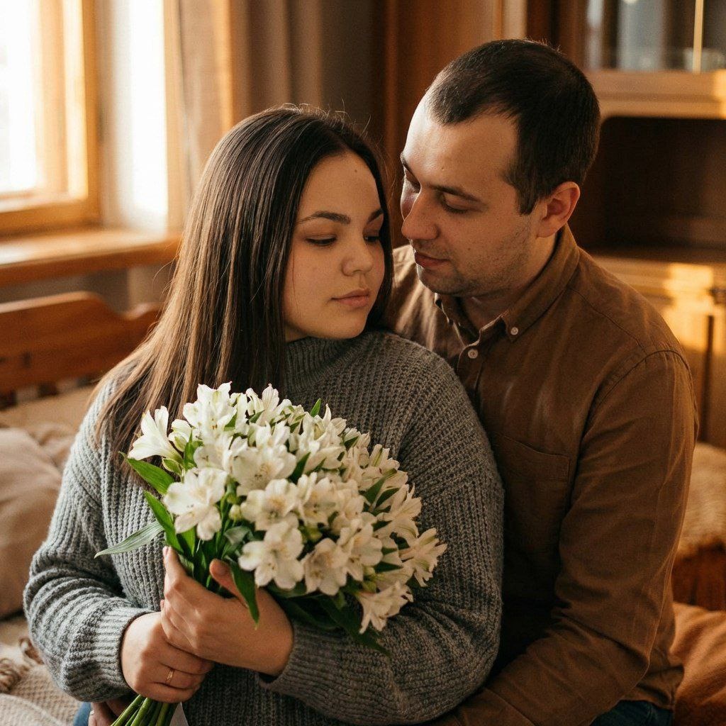 😀Выбираем "нейросети" 😀Нажимаем "Nano Banana" 😀Нажимаем "Nano Banana Pro" 😀Прикрепляем через скрепку свое фото и выбранный промпт 😀Наслаждаемся результатом😍 Создай фото не меняя черты лица и цвет волос. Волосы каштанового цвета, длинные прямые. Макияж-нюд. Тёплый интимный портрет пары в уютной комнате: объятия, крупный букет белых альстромерий у девушки в руках. женщина в плотном вязаном сером свитере, мужчина в коричневой рубашке, мягкий тёплый луч заходящего солнца из окна, боковой свет и мягкие тени, кинематографичная цветокоррекция, малая глубина резкости, лёгкая пленочная зернистость #парные