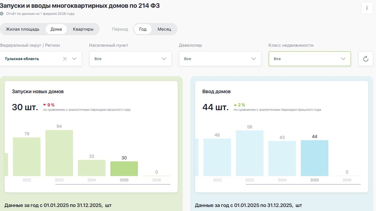 эксплуатацию. Я по традиции сравнила показатели Тульской области и 2х ближайших соседей: Калужской и Рязанской областей. Основные тезисы: 1. Калужская область в 2025 году стала лидером (среди сравниваемых областей) по количеству домов выведенных на рынок: 32 дома, против 30 в Тульской и 14 в Рязанской. Хотя если сравнивать непосредственно города, в Калуге запущено 20 домов, в Туле 25, а в Рязани 10. 2. В Тульской области запуск новых проектов в 25 году был меньше на 3 дома чем в 24 и в 3 раза меньше чем в 23. Информация о новых домах в 26 году - отсутствует. В Калужской области запуск чуть меньше (- 3 дома) чем в 25 и больше (+8) чем в 23. Так же в 26 уже запущено 3 новых дома. В Рязанской области падение 25 по сравнению с 24 составило -73%(!!!) Хотя в 26 тоже уже стартовали 2 дома. 3.Если смотреть ввод в эксплуатацию готовых домов и старт новых проектов, то цифры следующие: 2025 год (кол-во домов) Тула: + 30 - 44 Калуга: +32 - 24 Рязань: +14 -14 Какие прогнозы? В Рязани рынок сж