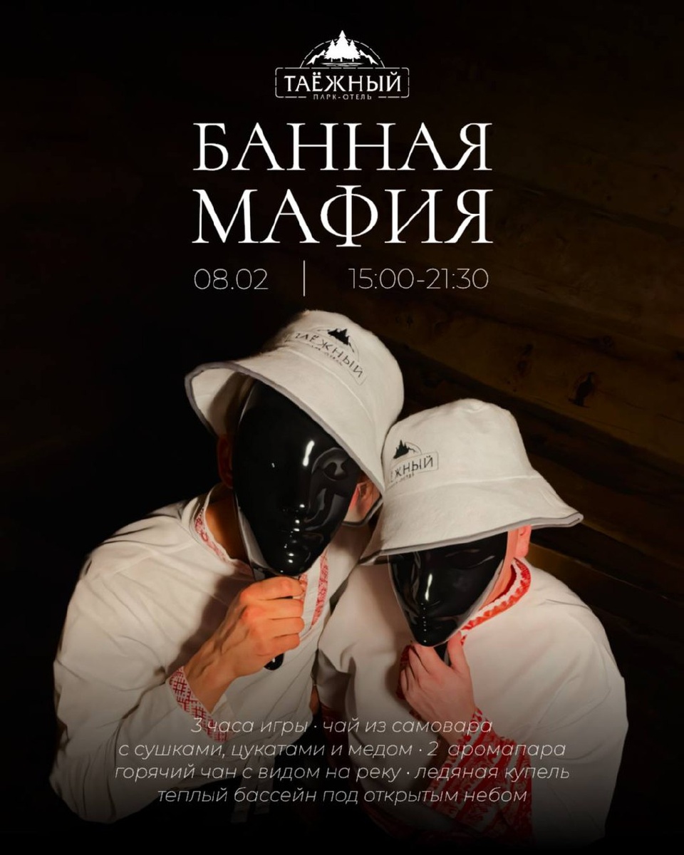 » 🤩🌲 8 февраля (вс) | 15:00 🛡️Кто же в этот раз одержит победу: люд честной или орда во главе с ханом? Узнаем уже в это воскресенье! Приглашаем вас, дорогие друзья, на банную мафию! Радушно встретим, накроем приветственный стол с душистым чаем из самовара, сушками, цукатами и медом ☕️✨ Программа: 15:00 — сбор гостей 15:30-18:30 — играем в мафию в атмосфере русских народных сказок в ресторане на территории парк-отеля 18:30-21:30 — отдыхаем в премиальном индивидуальном кедровом банном срубе «ДУХ ТАЙГИ», плаваем в теплом бассейне под открытым небом, делимся впечатлениями после игры в горячем чане с видом на реку, конечно же, паримся в настоящей русской бане, а самые смелые — могут окунуться в ледяную купель! 🌫️🪻🌿 В 19:00 и 20:30 — пройдут авторские коллективные аромапары от наших мастеров банного дела. Вы будете в восторге!😍 Стоимость: 6000₽ Набираем команду от 10 человек 👥 Количество мест на игру ограничено! Успейте забронировать ✔️ Сказка начинается здесь: 📍г. Мос