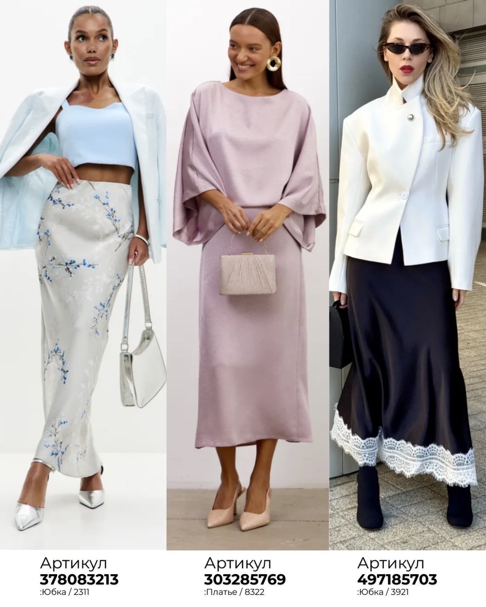 Эта подборка — готовый гардероб для торжеств и красивых выходов: здесь есть нежная база (пудровое платье, молочная юбка), эффектные акценты (чёрная миди с кружевом, корсет олива), универсальные жакеты (молочный и оливковый), а также аксессуары, которые ставят финальную точку (клатч шампань, винтажная сумка, сияющие туфли, серьги).