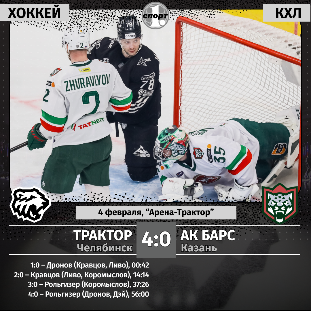 Хоккеисты челябинского «Трактора» в чемпионате КХЛ взяли реванш у казанского «Ак Барса», одержав «сухую» домашнюю победу — 4:0. Второй раз в сезоне сыграл на «ноль» голкипер Сергей Мыльников, впервые в сезоне оформил «дубль» Михаил Горюнов-Рольгизер, обновил счетчик, набрав два балла форвард Виталий Кравцов — это была лучшая игра «черно-белых» под руководством Евгения Корешкова, сообщает корреспондент ИА «Первое областное». В текущем сезоне команды уже встречались друг с другом. Матч в столице Татарстана завершился победой хозяев 3:2. Игра в Челябинске стала для соперников последней перед 7-дневным перерывом, связанным с проведением Матча звезд КХЛ. Разумеется, обе команды надеялись с хорошим настроением уйти на короткие каникулы. В предыдущих матчах хоккейные эксперты критиковали «черно-белых» за слабую реализацию голевых моментов. И не без оснований: челябинцы даже в проигранных матчах создавали больше остроты у ворот соперников, наносили немало бросков в створ, но дивидендов из свое