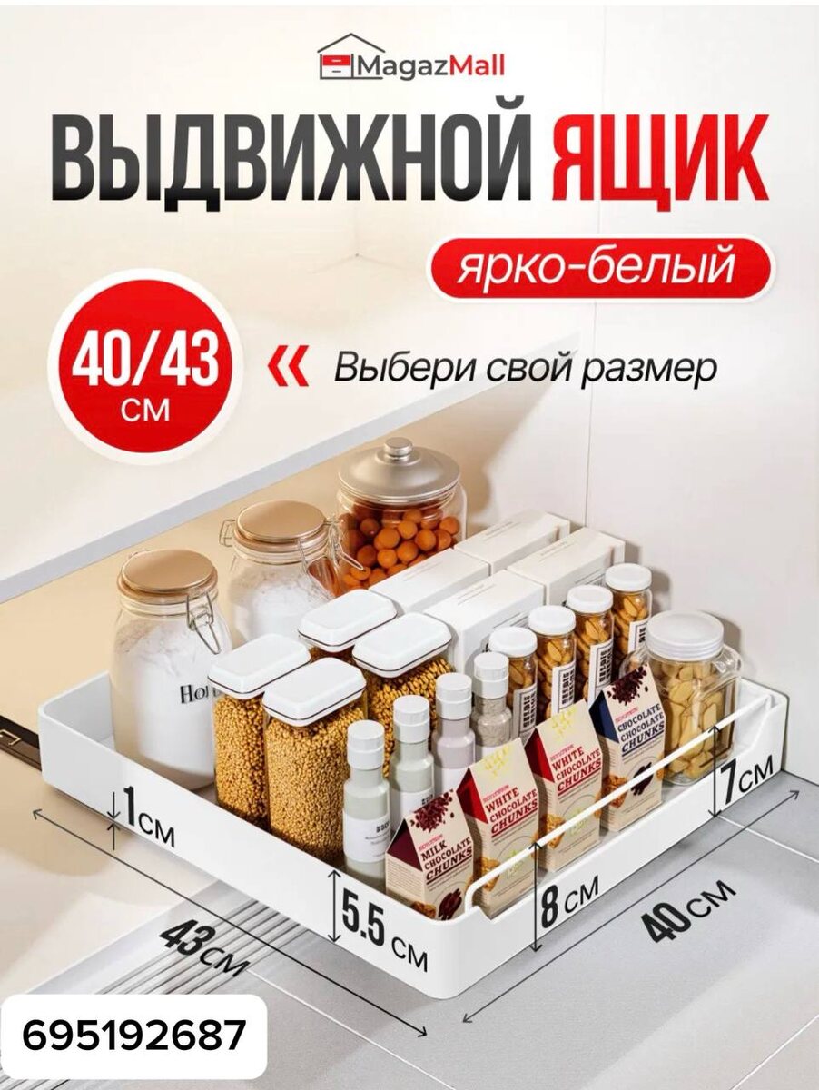 Выдвижной ящик выполнен в ярко-белом оттенке — универсальном и визуально «облегчающем» пространство. Размер 40×43 сантиметра делает его идеальным для кухонных шкафов, гардеробных систем и даже ванных зон.