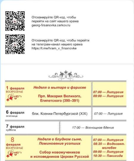 Сплошная седмица: 2 – 7 февраля – время заготовления на Великий Пост! 🕊️✨ В Неделю молитв и размышлений о мытаре и фарисее, Церковь дарует нам период особой радости и послабления – Сплошную седмицу, которая продлится со 2 по 7 февраля 🗓️. В эти дни, по уставу, отменяются любые виды поста 🚫, даже в традиционные постные дни – среду и пятницу. Это время, когда мы можем готовиться к предстоящему Великому посту. Не пропустите важные события этой недели: 🌟 Паломничество в Москву с отцом Антонием Железновым! 🏙️🙏 В эту субботу, 07 февраля, у нас есть прекрасная возможность совершить духовное путешествие по святым местам столицы в сопровождении нашего дорогого Настоятеля. Подробности и запись по ссылке 📝 Соборная молитва в Георгиевском храме в Фирсановке. ⛪ Приглашаем всех присоединиться к общей молитве, чтобы вместе прославить Господа 🙏 и укрепиться в вере. 💪 Пусть эта Сплошная седмица будет наполнена миром 🕊️, радостью 😊 и благодатью для каждого из вас! Публикуем расписание