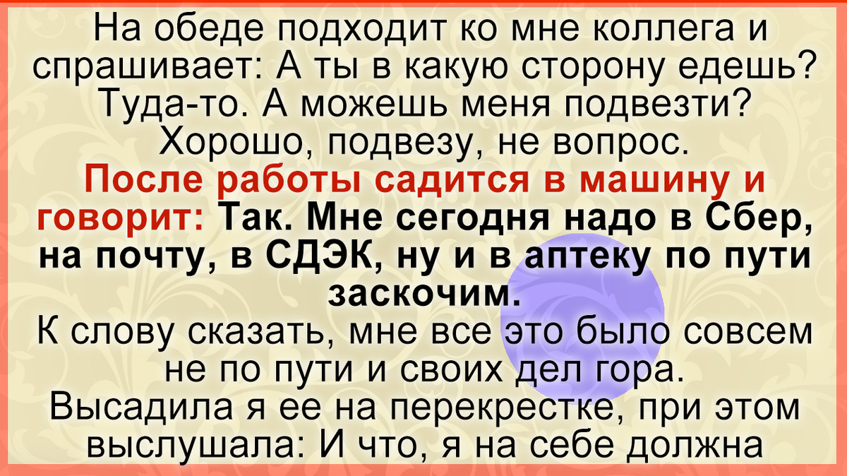 На обеде подходит ко мне коллега и спрашивает: А ты в какую сторону едешь? Туда-то. А можешь меня подвезти?
