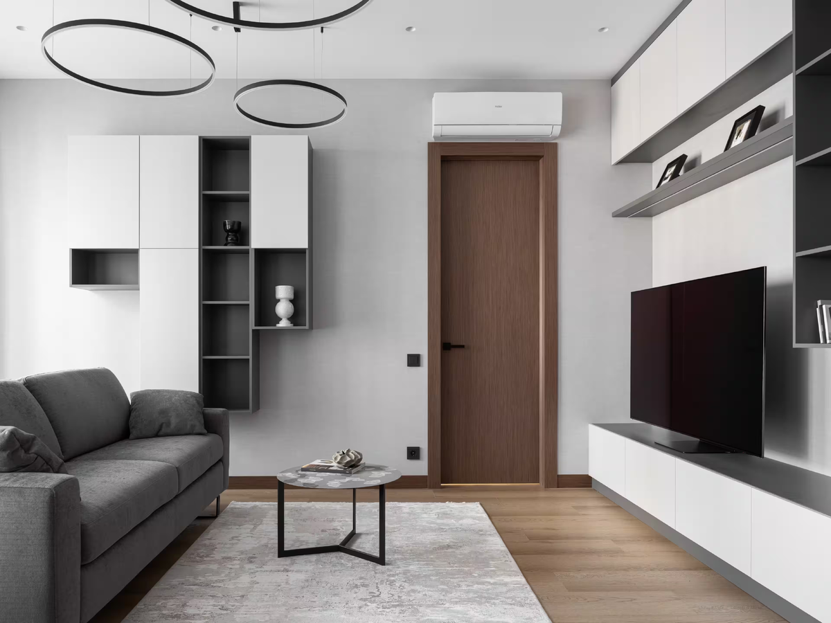 Эта квартира в московском ЖК “Кристалл” приобреталась для сдачи в аренду. Однако созданный интерьер так понравился владельцу, что он решил оставить её для себя. Хозяин квартиры хотел, чтобы в интерьере сочетались функциональность, практичность и комфорт. Всем этим требованиям идеально соответствует результат ремонта двухкомнатной квартиры в современном стиле. Благодаря двум большим окнам просторная гостиная наполняется естественным светом, что создаёт ощущение свободы и лёгкости. Этот эффект дизайнеры усилили с помощью светлой отделки стен. Для них выбрали обои под покраску. Около входа расположили зону кухни. Для мебели выбрали линейное расположение. Ставку здесь сделали на лаконичность форм. Монолитность композиции разбили с помощью элементов чёрного цвета. Столовую группу сместили к окну. Плавные линии мебели наполняют пространство гармонией и формируют акцент в этой зоне. Изящную композицию дополнили подвесным светильником испанского бренда Вибиа. Во второй части комнаты спланирова