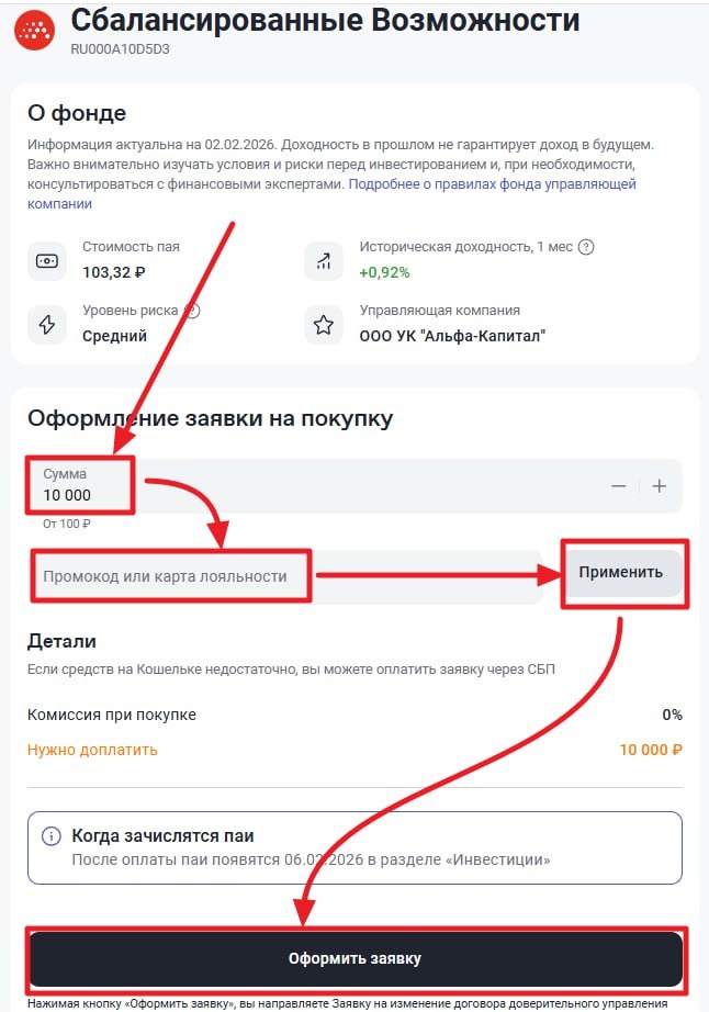. 2οΈβ£ ΠΡΠΊΡΠΎΠΉΡΠ΅ ΡΡΡΠ°Π½ΠΈΡΡ ΡΠΎΠ½Π΄Π°. 3οΈβ£ ΠΠ°ΠΆΠΌΠΈΡΠ΅ Β«ΠΊΡΠΏΠΈΡΡΒ». 4οΈβ£ ΠΠ° ΡΡΡΠ°Π½ΠΈΡΠ΅ ΠΎΡΠΎΡΠΌΠ»Π΅Π½ΠΈΡ Π·Π°ΡΠ²ΠΊΠΈ Π²Π²Π΅Π΄ΠΈΡΠ΅ ΡΡΠΌΠΌΡ ΠΎΡ 10 000 β½ ΠΈ ΡΠΊΠ°ΠΆΠΈΡΠ΅ ΠΏΡΠΎΠΌΠΎΠΊΠΎΠ΄ ΠΈ ΠΏΡΠΈΠΌΠ΅Π½ΠΈΡΠ΅ Π΅Π³ΠΎ. 5οΈβ£ ΠΡΠΎΡΠΌΠΈΡΠ΅ Π·Π°ΡΠ²ΠΊΡ. ΠΠΌΠ΅ΠΉΡΠ΅ Π²Π²ΠΈΠ΄Ρ , ΡΡΠΎ Π»ΠΈΠΌΠΈΡ ΠΏΠΎ Π±ΡΠ΄ΠΆΠ΅ΡΡ Π°ΠΊΡΠΈΠΈ ΠΎΠ³ΡΠ°Π½ΠΈΡΠ΅Π½, ΠΏΠΎΡΡΠΎΠΌΡ ΡΠ΅ΠΌ Π±ΡΡΡΡΠ΅Π΅ Π²ΠΎΡΠ²Π΅ΡΠ΅ΡΡ, ΡΠ΅ΠΌ Π±ΠΎΠ»ΡΡΠ΅ Π²Π΅ΡΠΎΡΡΠ½ΠΎΡΡΠΈ, ΡΡΠΎ ΠΏΠΎΠΏΠ°Π΄Π΅ΡΠ΅ Π² Π±ΠΎΠ½ΡΡπ₯ β οΈ ΠΡΠΎΠΌΠΎΠΊΠΎΠ΄ - PIFBALANCE ΠΠ½Π²Π΅ΡΡΠΈΡΠΈΠΎΠ½Π½ΡΠ΅ ΠΏΠ°ΠΈ Π½Π΅ ΠΏΡΠΎΠ΄Π°Π²Π°ΡΡ 90 Π΄Π½Π΅ΠΉ Ρ Π΄Π°ΡΡ ΠΏΡΠΈΠΎΠ±ΡΠ΅ΡΠ΅Π½ΠΈΡ. Π ΡΠ΅ΡΠ΅Π½ΠΈΠ΅ 20 Π΄Π½Π΅ΠΉ ΠΏΠΎΡΠ»Π΅ Π·Π°Π²Π΅ΡΡΠ΅Π½ΠΈΡ ΡΡΠΎΠΊΠ° ΠΏΠ»Π°ΡΡΠΎΡΠΌΠ° Π½Π°ΡΠΈΡΠ»ΠΈΡ Π½Π° Π²Π½ΡΡΡΠ΅Π½Π½ΠΈΠΉ ΡΡΠ΅Ρ 1000 β½. ΠΡΠΎ Π½Π΅ΠΌΠ½ΠΎΠ³ΠΎ, Π½ΠΎ ΠΊΠ°ΠΊ Π΄ΠΎΠΏΠΎΠ»Π½ΠΈΡΠ΅Π»ΡΠ½Π°Ρ Π΄ΠΎΡ