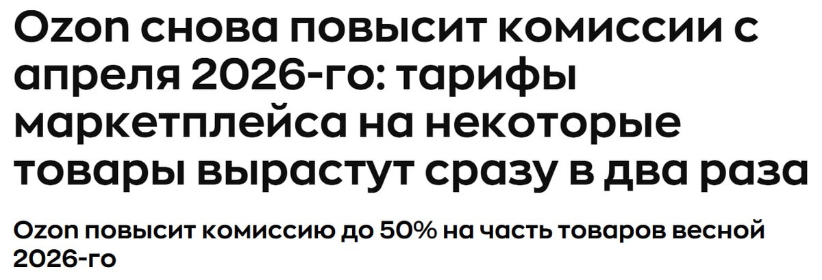 Ozon официально перепрошивает экономику селлеров Если коротко — комиссии растут. Местами — до 50–55%. Разбираю подробнее. 💙 Комиссия теперь зависит от цены товара Ozon вводит ценовые сегменты — от 0 ₽ до 10 000+ ₽. Логика простая: чем дороже товар — тем выше процент комиссии. 💙 товары до 300 ₽ почти не трогают 💙 самый дорогой сегмент — средний чек 💙 в большинстве категорий комиссии растут То есть удар — туда, где у большинства селлеров и была основная маржа. 💙 Конкретные цифры По данным РБК и официальных сообщений Ozon: 💙 Одежда (FBO) Комиссия вырастает до 43–48% Раньше — до 36% 💙 Обувь и детские товары До 50% 💙 Мебель (кресла и т.п.) С 35% → 37–42% 💙 Электроника Телевизоры: 31% → 34–38% Смартфоны — почти не тронули (до 27%) 💙 Рекордсмены Товары личной гигиены и чемоданы — до 55% комиссии (раньше ~43–44%) 💙Это впервые за историю Ozon, когда ставки по категориям переваливают за 50%. Изменения вступают в силу с 6 апреля 2026 года и касаются FBO, FBS и realFBS. 💙O