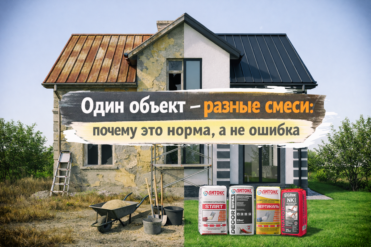 Когда на объекте подрядчик или мастер видит, что для одной квартиры/дома/фасада требуется несколько видов сухих смесей — многие удивляются. «Почему нельзя взять одну универсальную?» — частый вопрос. Ответ прост и практичен: разные задачи требуют разных инструментов. Это нормально, это профессионально — и именно так достигается долговечность и экономия в долгосрочной перспективе. На одном объекте обычно встречаются разные поверхности и условия: Каждая из этих ситуаций предъявляет свои требования к составу смеси: прочность, эластичность, влагостойкость, морозостойкость, адгезия, толщина слоя и скорость набора прочности. Поэтому набор из штукатурок, шпаклёвок, плиточных клеев, ровнителей, гидроизоляций и грунтовок — это нормальная практическая «сборка» системы, а не признак неопытности. С ассортиментом ТМ «Литокс» можно покрыть все эти базовые потребности: штукатурки, декоративные покрытия, шпатлёвки, плиточные клеи, ровнители и наливные полы, гидроизоляция, ремонтные смеси, краски и гру