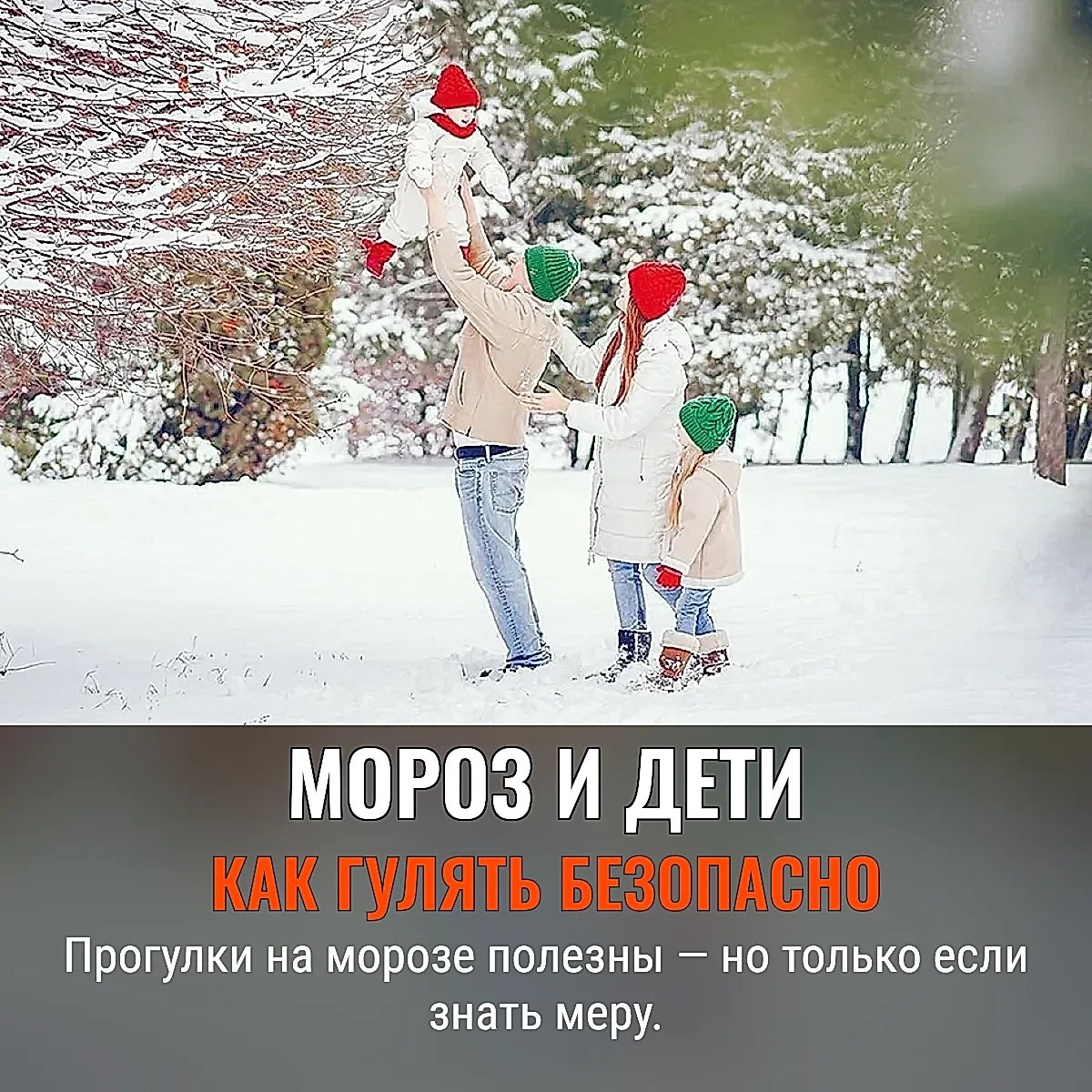 Свежий воздух очищает дыхательные пути и тренирует иммунитет. Главное — знать меру и соблюдать простые правила. 👶 Для малышей до года безопасна температура до −10°C (в северных регионах — до −15). Дошкольники выдержат до −15°C, а школьники — до −20°C. При ветре ориентир поднимаем на 5°. 🧥 Одеваем слоями: первый — отводит влагу, второй — сохраняет тепло, третий — защита от ветра. Варежки теплее перчаток, обувь — свободная. ⚠️ Проверяйте малыша каждые 15–20 минут: перегрев и переохлаждение опасны одинаково. 🌤 Лицо не закрываем шарфом, используем защитный крем, при морозе ниже −15°C — желательно с SPF. После прогулки — согреть ребёнка, но без батарей и грелок 🔥 Зима — не враг, если гулять с умом! Москва Здорова / Нет времени болеть