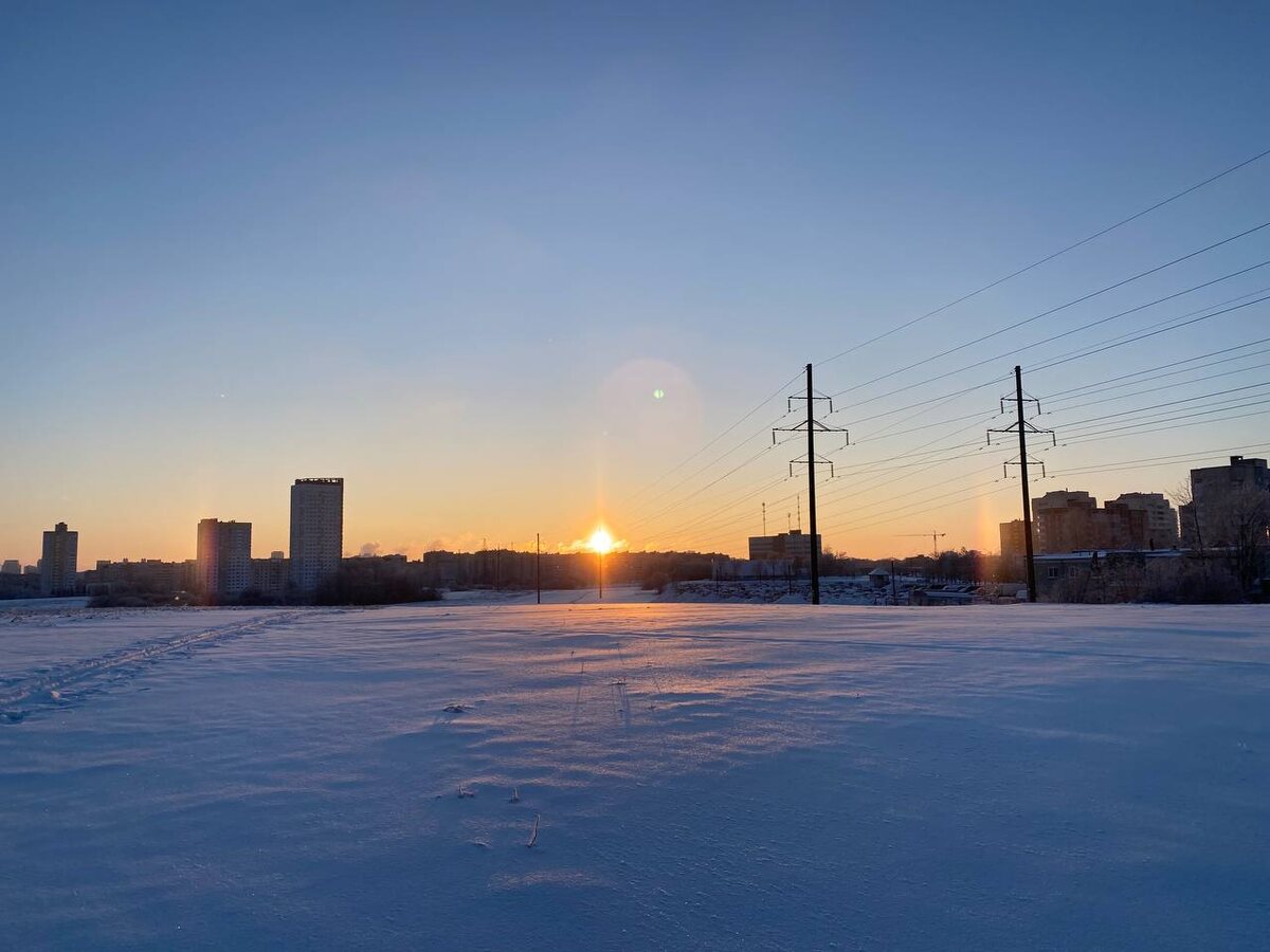 Рассвет 1 февраля. И тоже солнечное гало по бокам, поднимается вместе с солнцем