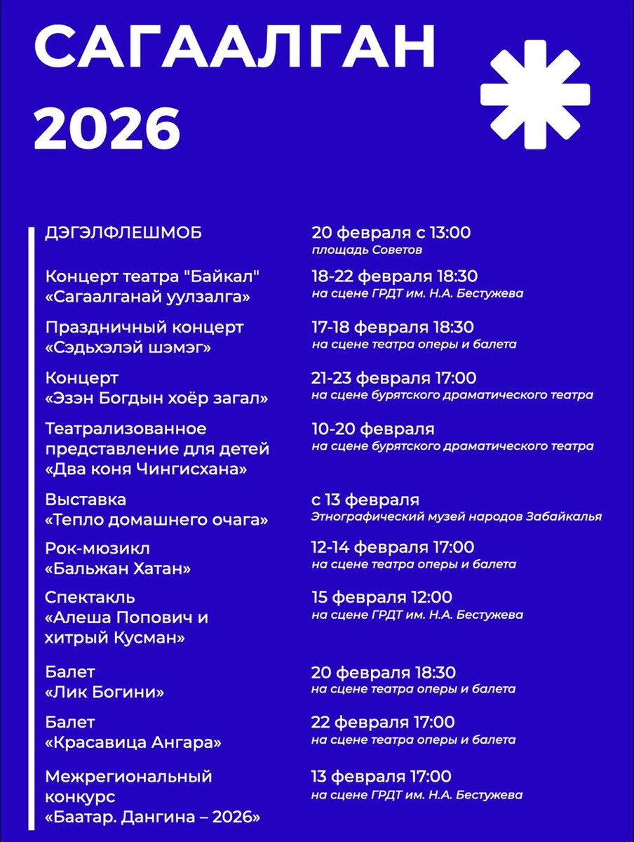 ! 🏮 Министерство культуры Бурятии и подведомственные учреждения подготовили насыщенную программу мероприятий, которые пройдут в феврале и марте 2026 года. 📅 Основные события: • Яркий Дэгэлфлешмоб с шествием по центру Улан-Удэ — 20 февраля • Концерты от театров «Байкал», Буряад театра, Оперы и балета • Выставки, мастер-классы, лекции в музеях и библиотеках • Детские спектакли, балеты и рок-мюзикл • Онлайн-турниры и виртуальные выставки Приглашаем всех жителей и гостей республики разделить радость праздника, окунуться в традиции и ощутить тепло Сагаалгана! ❤️ Подробное расписание — в афише мероприятий.