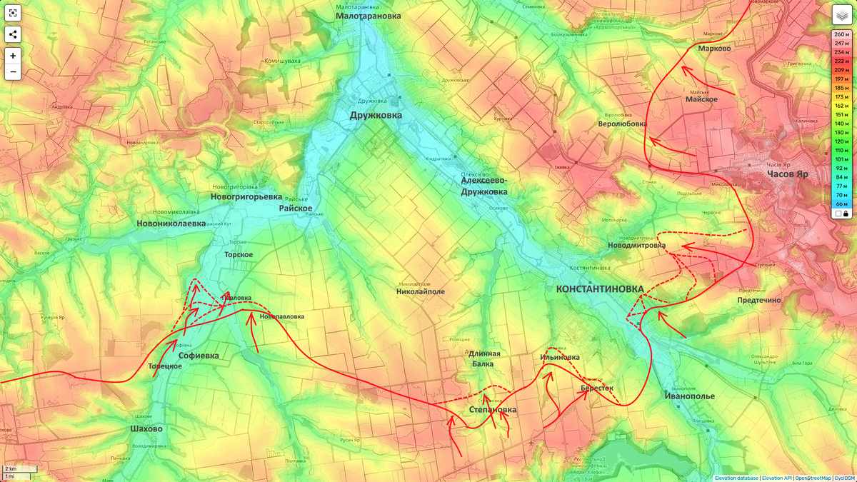 МО РФ официально объявило об освобождении н.п. Степановка (находящегося западнее Константиновки). Событие ожидаемое. Упорные бои за это небольшое село продолжались на протяжении двух недель. И этот успех позволяет нам зацепиться за верховья поросшей деревьями и кустарниками Длинной Балки, которая тянется на много километров на север и заходит в тыл Константиновке. Но далее нам здесь надо занять одноименной с балкой село. До которого от Степановки примерно 500 метров. Важный успех группировки «Юг» для блокады Константиновки. Но если возьмем и Длинную Балку и соседнее село Николайполе, то тем самым обеспечим фланги одновременно для частей ведущих бои за соседнюю Ильиновку и для частей группировки «Центр» наступающей западнее на Торское. Держим кулаки и молимся за наших парней...