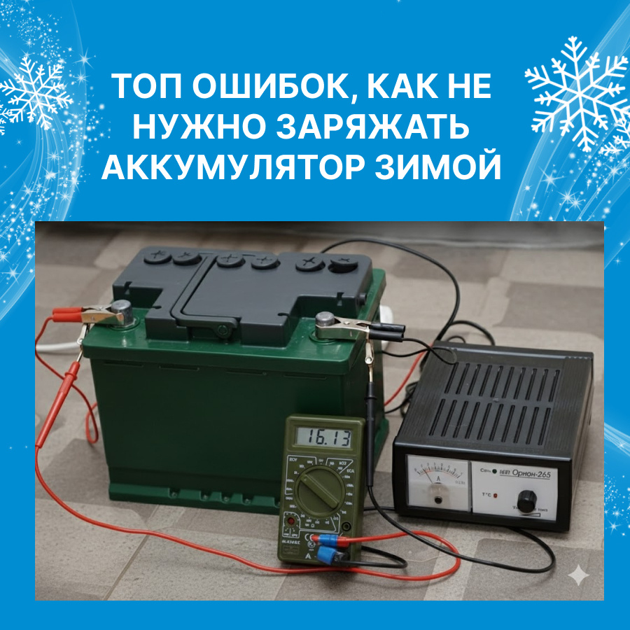Зимой автомобильные аккумуляторы теряют до 50% емкости при температурах ниже -20°C из-за замедления химических реакций, поэтому неправильная зарядка может их быстро вывести из строя. Вот топ распространенных ошибок, которых стоит избегать: Заряжать АКБ прямо на улице при отрицательных температурах неэффективно: электролит густеет, батарея плохо принимает заряд, а реакции замедляются. Лучше занести аккумулятор в теплое помещение и дать ему отогреться пару часов перед подачей тока. Для заряда аккумулятора рекомендуем универсальное зарядное устройство Вымпел-57 подходит для автомобильных и мотоциклетных аккумуляторных батарей номиналом 6/12 В. любого типа, включая полностью разряженные. Оно поддерживает автоматический режим зарядки с регулировкой тока от 0,8 до 20 А и напряжения от 7,4 до 18 В оснащено ЖК-дисплеем, защитами от перегрева, короткого замыкания и переполюсовки, а также может использоваться как блок питания или вольтметр. Ссылка на товар: orionspb.ru/charger/5117/ Оформить зак
