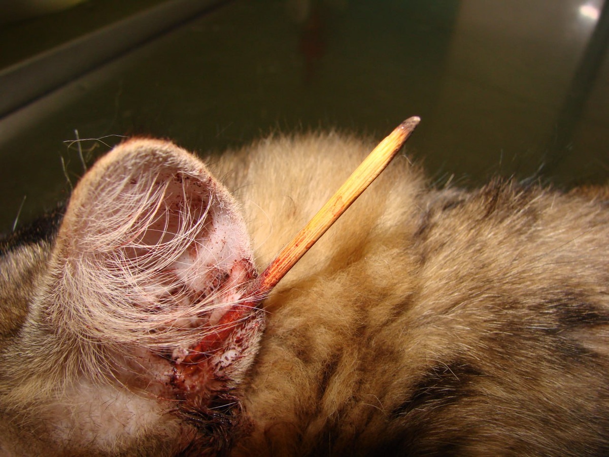 18+ Инородное тело в ушном проходе у кошки. Прободение сквозное и край острой палки виден из ротовой полости. Задача - с минимальными повреждениями тканей и целиком (без повреждений) извлечь из слухового прохода и ротовой полости само инородное тело. Сама операция прошла успешно. Лечение длительное. Прогноз на сохранение слуха и координации движения крайне осторожный.