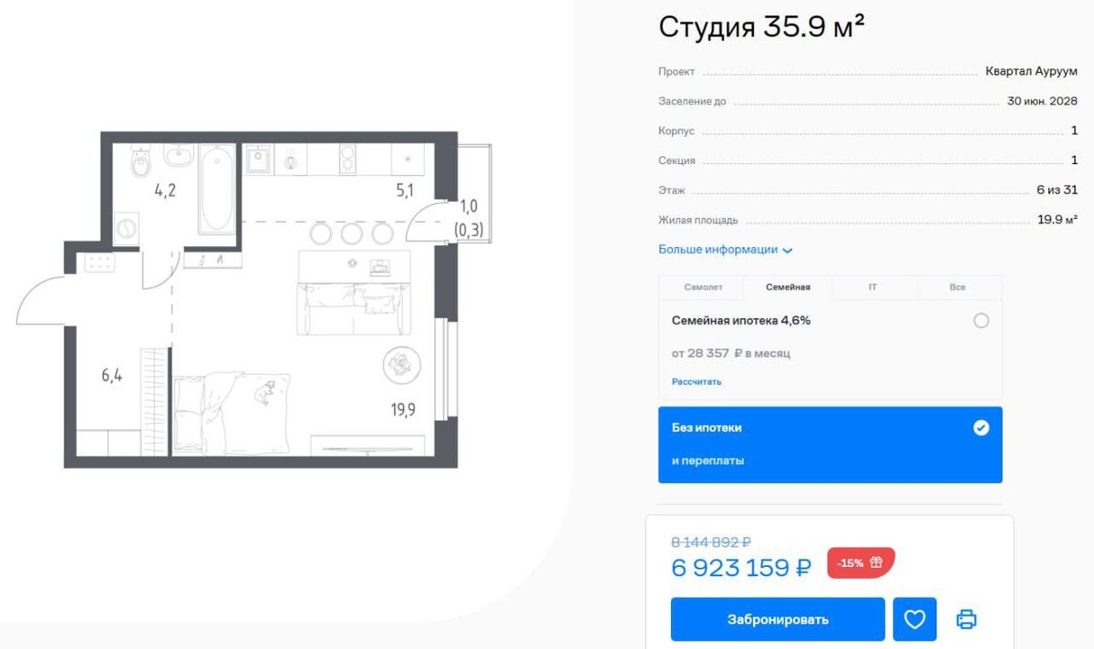 ✌️ Возьмем для расчетов самую доступную по деньгам квартиру - студию! Так как дом не эконом и даже не комфорт, а близкий к бизнесу, площадь для студии с шиком 35,9 кв.м. Кому захочется, можно поставить стену и сделать из неё полноценную 1к👌 Варианты цен, скидок и расчетов в зависимости от вашей ситуации👇 1 вариант: Семейная и Ит ипотека под 3.5% на весь срок!!! Цена 6.923.159 ПВ 1.391.000 Ежемесячный платеж - 24.800👍 Подходит для тех, кто не планирует быстро за 3-5-7 лет закрыть ипотеку. 2 вариант: Семейная и Ит ипотека под 6% на весь срок и наличные Скидка 10%. Цена 6.230.000 ПВ 1.252.000 Платеж - 29.800👍 Подходит для тех, кто планирует закрыть ипотеку досрочно! 3 вариант Траншевая ипотека Сбербанк, для всех, не льготная, базовая Скидка 6% Цена 6.507.000 Если ПВ 20,1% - 1.308.000, ежемесячный платеж 9.000😱 до августа 2027 Если ПВ 30,1% - 1.958.000, ежемесячный платеж 1.700😱 до августа 2027 Сдача дома октябрь 2027 Далее Сбер установит рыночную ставку , ожидается 8-9%, ухо