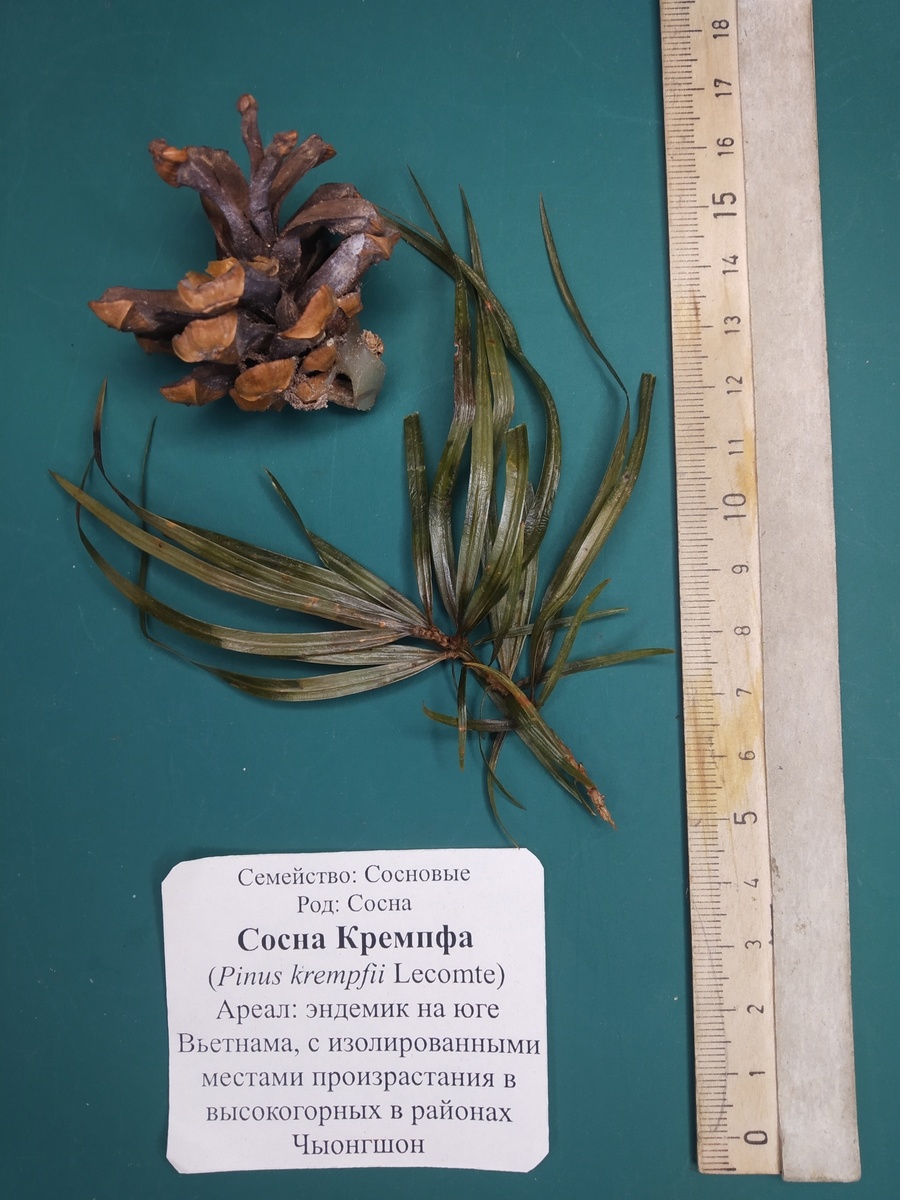 интереснее шишек. Она сплюснутая лопастной формы длиной 3-6 см и шириной 1,5-5 мм. Места произрастания изолированы, находятся в высокогорных районах Чыонгшон. Известно менее десяти мест находок. Популяция сильно сократилась из-за антропогенных факторов, в связи с ростом