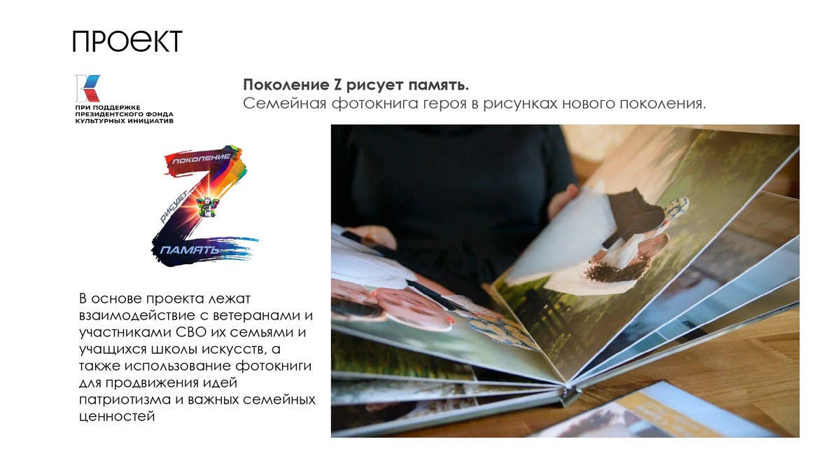 Создание уникальных фотокниг "Жизнь в кадрах и красках" для семей участников и ветеранов СВО, где семейные фото и архивные снимки будут дополнены художественными иллюстрациями, созданными учащимися детской школы искусств на основе личных встреч и воспоминаний самого героя. Завершение - выставка работ и вручение фотокниг.
