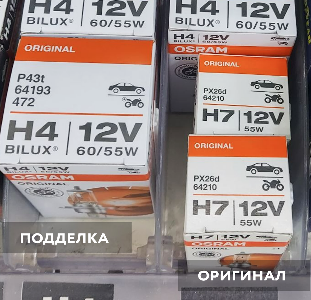 Вопрос не только в недостатке яркости, но также в абсолютно неправильной геометрии ламп, которая влечет отсутствие правильной СТГ и засветку полосы встречного движения. К сожалению, внешне отличить по упаковке оригинальные лампы от поддельных бывает очень сложно. Только имея в руках оригинал, есть шанс найти отличия. Наша фотография - иллюстрация того, что в одном магазине, на одной полке могут соседствовать поддельные и оригинальные лампы OSRAM. Многие подделки отличаются фактурой и цветом картона, из которого изготовлена упаковка. Обратите внимание, у поддельных ламп картон обычно более гладкий и имеет синеватый оттенок. Рекомендуем приобрести оригинальные лампы в магазине Nobium (новое название команды OSRAM на российском рынке) на OZON и не выкидывать упаковку. » Только оригинальный OSRAM от Nobium здесь