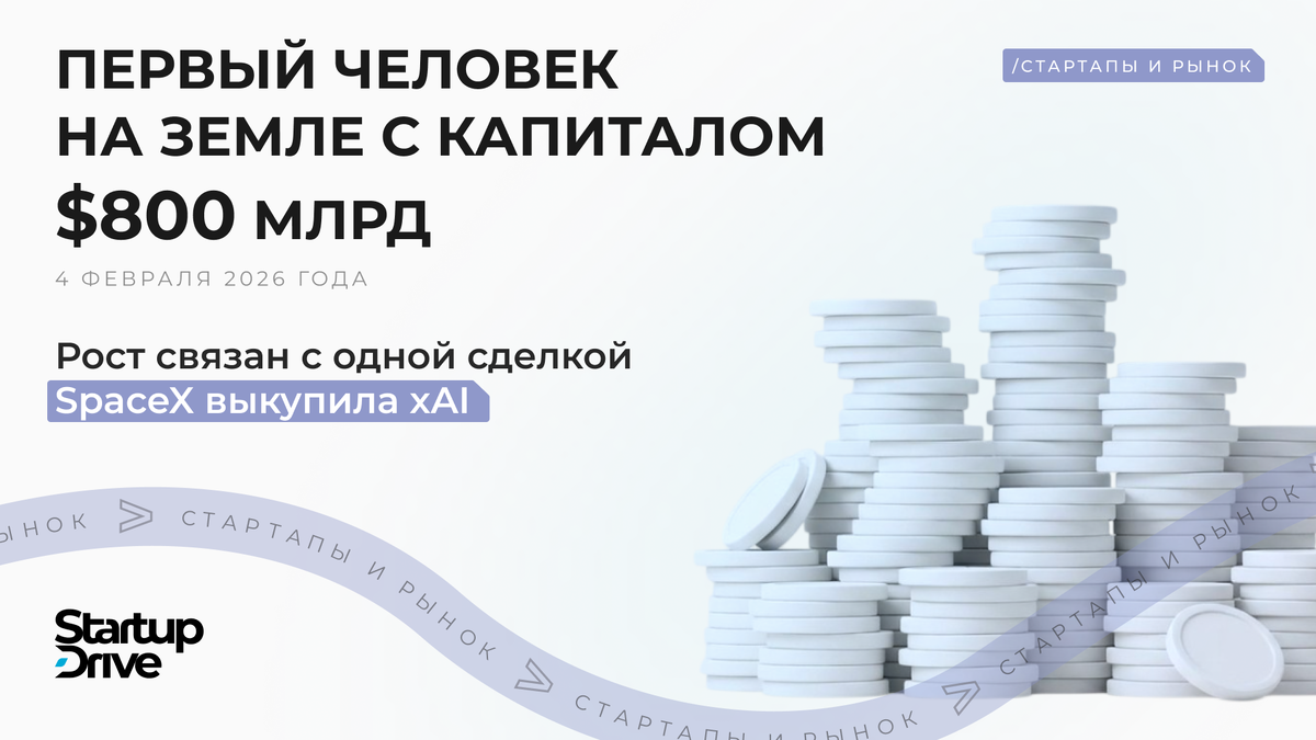4 февраля 2026 года, Forbes оценил состояние Илона Маска выше $800 млрд. Это первый подобный случай в истории. Рост связан с одной сделкой. SpaceX выкупила xAI, после чего Forbes оценил объединённую структуру в $1,25 трлн. Доля Маска составила около 43%, что дало ему пакет более чем на $540 млрд только в этом активе. С учётом Tesla и опционов итоговая оценка состояния приблизилась к $850 млрд. До сделки SpaceX и xAI учитывались отдельно. После объединения появился один крупный актив и одна доля, что упростило расчёт и резко увеличило итоговую цифру. Отрыв от остальных миллиардеров теперь выглядит почти нереальным. Маск опережает второго человека в рейтинге Forbes Real-Time Billionaires — сооснователя Google Ларри Пейдж — примерно на $575 млрд. Состояние Пейджа сейчас оценивается в районе $280 млрд. По текущим оценкам, Маску остаётся пройти примерно половину этой суммы, чтобы теоретически приблизиться к отметке $1 трлн личного капитала. Важно, что речь идёт об оценке частной компании. О