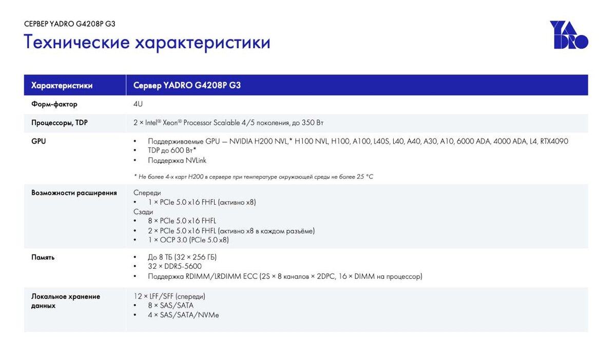 G3 (включены в Единый реестр российской радиоэлектронной продукции Минпромторга) Тестирование подтвердило готовность новых серверов к эксплуатации в корпоративных инфраструктурах с повышенными требованиями к производительности при работе с передовыми моделями искусственного интеллекта Тесты проводились группой компаний ЦРТ на базе операционных систем Astra Linux и Platform V SberLinux В составе тестовой конфигурации использовались четыре графические карты, обеспечивавшие необходимый уровень производительности при работе с моделью Пилотный проект подтвердил готовность серверов к работе с современными ИИ-нагрузками — от анализа больших данных до прикладного использования ML-решений Ключевой запрос крупного бизнеса и госсектора — внедрение прогрессивных отечественных решений на основе генеративного искусственного интеллекта. Актуальный тренд — внедрение облачных решений, но при повышенных требованиях к безопасности формируется спрос на on-prem-внедрения — установку в закрытый контур