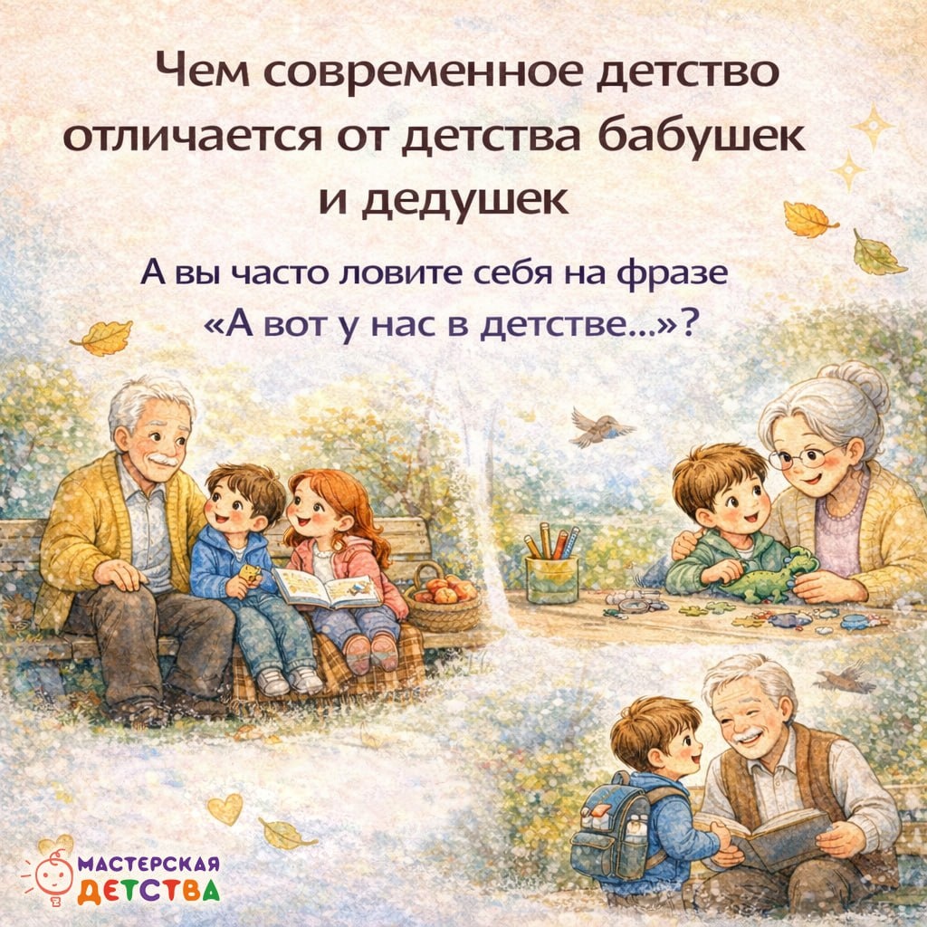 Если честно, разница заметна сразу 😊 Вы росли в мире без интернета, с дворовыми играми, строгими правилами и фразой «сами разберётесь». А сегодня дети с планшетами, разговорами про эмоции и вопросами, на которые не всегда есть готовый ответ. Что действительно изменилось по сравнению с детством бабушек и дедушек: 🌍 Мир стал быстрее и более шумным Раньше ребёнок узнавал мир постепенно: двор, школа, книги. Сегодня информации много сразу, и детская нервная система с этим справляется не всегда легко. 💬 С детьми больше разговаривают Современных детей чаще спрашивают, что они чувствуют и чего хотят. Это может удивлять, но так формируется умение понимать себя и других. 🧸 Детство стало более «под присмотром» Раньше гуляли до темноты. Сегодня - безопасность, расписания, кружки и контроль. Не потому что дети слабее, а потому что мир сложнее. А что совсем не изменилось: 💫 Ребёнку всё так же нужен близкий взрослый ☀️ Бабушка и дедушка остаются источником спокойствия и принятия 💗 Совмест