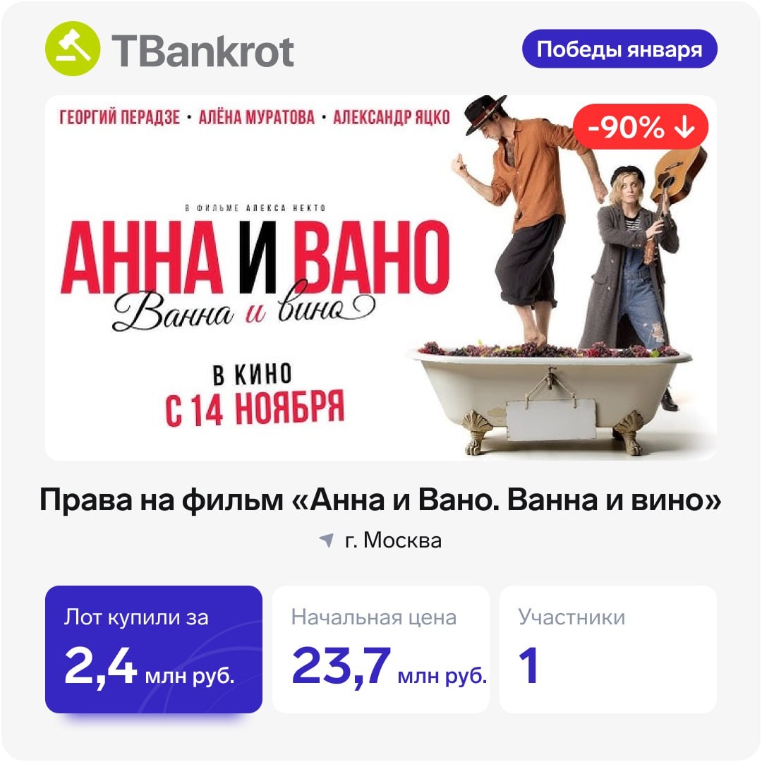 ? Иногда встречаются лоты, коммерческий потенциал которых не сразу очевиден. В этом посте — подборка именно таких позиций: давайте вместе подумаем, как на них можно заработать. Делитесь в комментариях идеями, для кого это может быть полезно и как бы вы превратили это в прибыль. 🎬 Права на художественный фильм «Анна и Вано. Ванна и вино» >> https://clck.ru/3RdBkH — Лот выкупили за 2,4 млн ₽ — Цена снизилась на 90% — Лот забрал единственный участник 🚌 Остановочный павильон >> https://clck.ru/3RdBjV — Лот выкупили за 30 000 ₽ — Цена снизилась на 89% — Лот забрал единственный участник 🏗 Канализация и насосная станция >> https://clck.ru/3RdBj9 — Лот выкупили за 420 000 ₽ — Цена снизилась на 96% — В торгах было 2 участника Пишите свои версии 👇