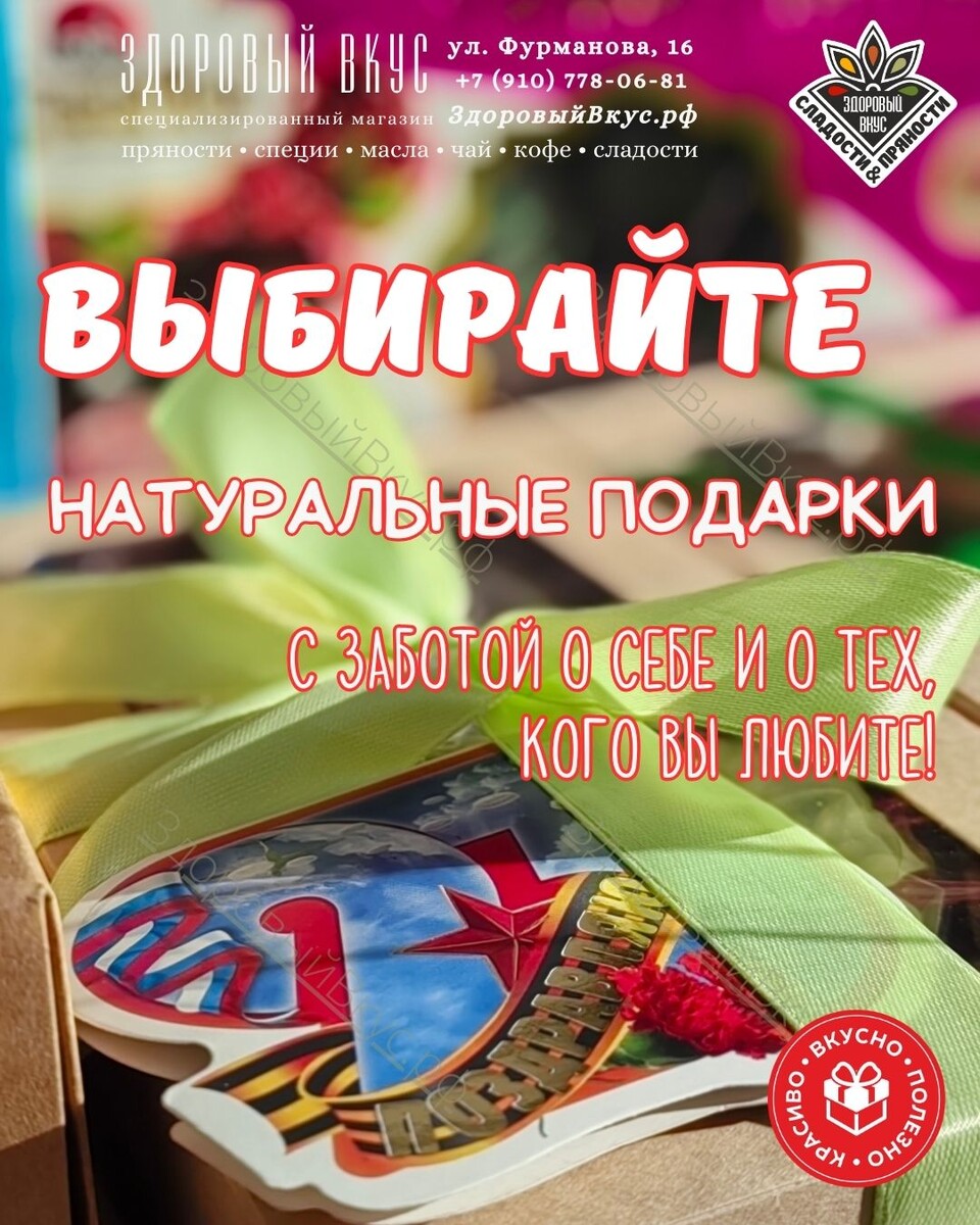 💫 23 февраля всё ближе, и этот праздник — отличный повод проявить особое внимание к мужчинам. Натуральный подарок всегда вызывает искренние эмоции: он подчёркивает индивидуальность, заботу и желание порадовать не только внешней красотой, но и настоящим вкусом. 😍 В такой подарок вложен смысл — его выбирают осознанно, чтобы порадовать по‑настоящему, без банальности и формальности. Это не просто вещь, а небольшое событие, которого ждёшь с удовольствием. ❤️ Всё, что мы предлагаем, создаётся с любовью к качеству и к деталям: по-настоящему вкусно, полезно и красиво. 💯 Почему выбирают натуральные подарки: - безопасно и полезно для здоровья - оригинально и со вкусом - подойдёт для любого возраста и статуса 🚪 Загляните к нам — у нас можно найти решение для необычного праздничного подарка, который останется в памяти и наполнит праздник особой атмосферой. 🎁 Эко-подарки в наличии и под заказ НАТУРАЛЬНЫЕ, ВКУСНЫЕ, ПОЛЕЗНЫЕ и КРАСИВЫЕ подарочные наборы. 🍯 Орехи в меду, крем-мед, натуральный ме