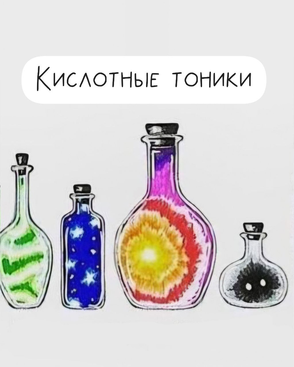 Не относитесь к ним, как к водичке после умывания. Они отлично влияют на качество кожи в долгую Зачем он вообще нужен? Кислотный тоник это лосьон или эссенция с AHA, BHA или PHA-кислотами в низкой, безопасной концентрации для регулярного применения Что он делает? • Мягко отшелушивает: растворяет связи между ороговевшими клетками, кожа становится гладкой, без ощущения сухой «наждачки» • Работает с порами, особенно BHA, которые проникают внутрь пор, растворяют себум и снижают риск воспалений • Выравнивает тон и рельеф: постепенно осветляет постакне и неровности • Повышает эффективность ухода: после кислотного тонера сыворотки и кремы проникают лучше Как выбрать свой кислотный тоник? Ориентируемся не на бренд, а на тип кислот и состояние кожи • AHA-кислоты: гликолевая, молочная, миндальная. Работают на поверхности кожи. Подходят для сухой, нормальной, обезвоженной, тусклой кожи, неровного тона и первых морщин. Хороши для вечернего ухода • BHA-кислота, то есть салициловая. Работает внут