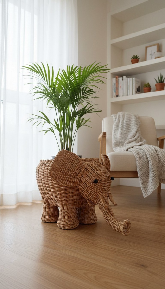 Слон как символ мудрости, силы и памяти вносит в дом особую энергетику. Плетёный слон — образ мягкий и немного ироничный: крупное животное в миниатюрном декоративном жилище.