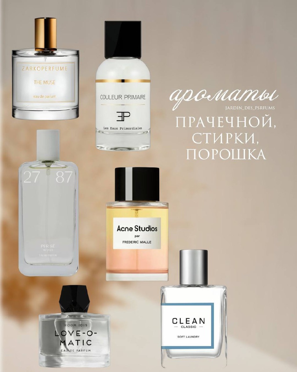 Прачечная, стирка, порошок: - Zarkoperfume The Muse - Les Eaux Primordiales Couleur Primaire - 27 87 Per Se - Room 1015 Love-O-Matic - Frederic Malle Acne Studios - Clean Soft Laundry Ткань, простыни, белая рубашка: - Maison Francis Kurkdjian 724 - LM Parfums Chemise Blanche - Maison Martin Margiela Replica Lazy Sunday Morning - Serge Lutens L'Eau - Vilhelm Parfumerie Room Service - Narciso Rodriguez Pure Musc For Her Чистота, свежесть, ясность: - Parle Moi de Parfum Totally White - Byredo Inflorescence - Laurent Mazzone Parfums Radikal Water Lily - Kilian Roses On Ice - L'Atelier Parfum Rose Coup de Foudre - Arcadia 8 Cerulean Crystal Вторая кожа, тальк, прикосновения: - Attar Collection Second Skin - Juliette Has A Gun Not A Perfume - 27 87 # Hashtag - New Notes Talco - Clive Christian E Cashmere Musk - Areej Attar Collection Уход, мыло, крем: - The Harmonist Yin Transformation - Arabesque Perfumes Elusive Musk - Nishane Meant To Be Seen - The Merchant of Venice My Pearls - SIU Eu