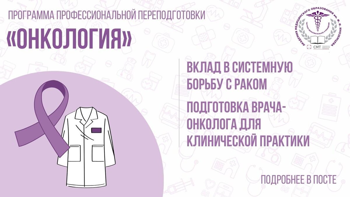 4 февраля, во Всемирный день борьбы против рака, особенно ясно, что ключевую роль в изменении онкологических исходов играет подготовка специалистов. Рак — это не одна дисциплина и не один этап лечения. Это сложный, многоуровневый путь, который требует глубокой клинической экспертизы. 🔬 Программа профессиональной переподготовки «Онкология» Программа направлена на подготовку квалифицированного врача-онколога, способного вести пациента на всех этапах: от ранней диагностики и выбора тактики лечения до паллиативной помощи и реабилитации. Кому подойдёт программа? Врачам с высшим медицинским образованием, прошедшим интернатуру или ординатуру по смежным специальностям (терапия, хирургия, урология, гинекология, ОВП, гематология, нейрохирургия и др.) Что формирует программа: ✔ системное понимание онкологического процесса ✔ навыки диагностики, стадирования и ведения онкологических пациентов ✔ умение применять современные методы лечения ✔ готовность к оказанию паллиативной помощи ✔ знание о