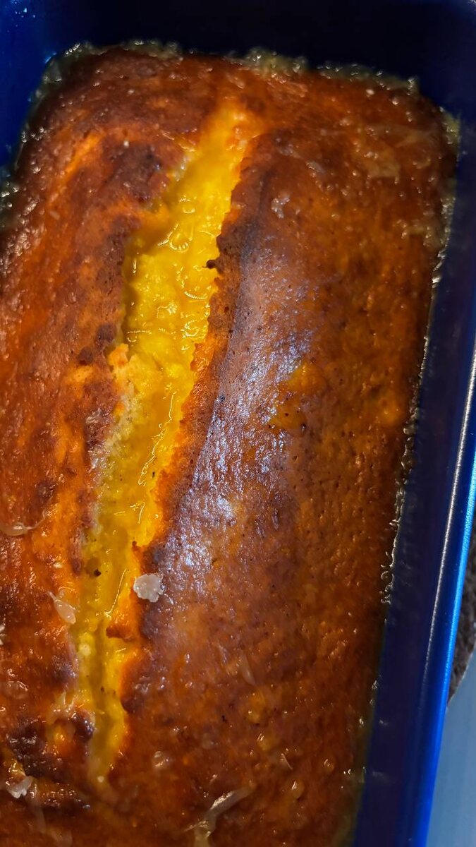 🍊 рецепт отжала в инстаграме (Яна, спасибо!), чуть-чуть подредачила. всё супер просто и очень апельсиново-дофаминово! блендерим: один средний апельсин вместе с кожурой (примерно 250 грамм), 45 грамм растительного масла, три яйца. апельсин порежьте на крупные куски. перемешиваем в миске венчиком: массу из блендера, 150 грамм сахара, 5-10 грамм ванильного сахара или ванилина, пакетик разрыхлителя (7-10 грамм), 150 грамм муки. по консистенции тесто должно быть чуть гуще, чем на блины, и легко стекать с венчика. поэтому муку регулируйте по ощущениям, в изначальном рецепте было вообще 200, например. переливаем в форму (я её смазала чуточкой сливочного масла, буквально грамм пять), делаем лопаткой продольный надрез в середине, заливаем туда ~5 грамм растительного масла: выйдет красиво, как на фото. выпекаем 30-35 минут при 200 градусах, проверяем готовность зубочисткой: возможно, понадобится чуть больше или чуть меньше времени. на готовый кекс выливаем сок одного апельсина (можно двух