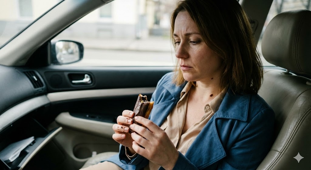 Когда пакет опустел, достала из бардачка влажные салфетки. Вытерла руки. Губы. Проверила в зеркале — не осталось ли крема в уголке рта.