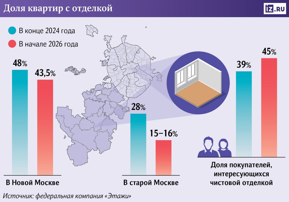 В старой Москве доля квартир без отделки достигла 85% — это рекордный уровень за последние годы.