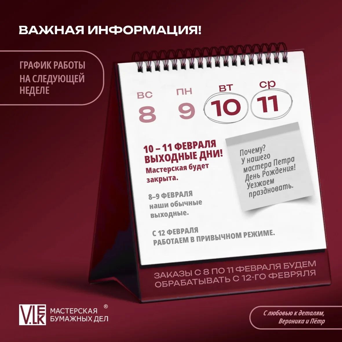 ! Заблаговременно информируем вас об изменении рабочего графика на следующей неделе. Взгляните на картинку - мы решили устроить себе мини-отпуск посреди февраля. 😊 Причина самая что ни на есть уважительная - у моего мужа и сооснователя мастерской, Петра, День Рождения! (9февраля) 🥳 Поэтому 10 и 11 февраля (вторник и среда) мы будем недоступны - мастерская закрыта. Не волнуйтесь, с 12 февраля (четверг) мы снова в строю! Заявки, оформленные в период с 8 по 11 февраля, будут обработаны и взяты в работу 12 февраля в порядке очереди. Благодарим за понимание! #МастерскаяБумажныхДел #НашиВыходные #ДеньРождения