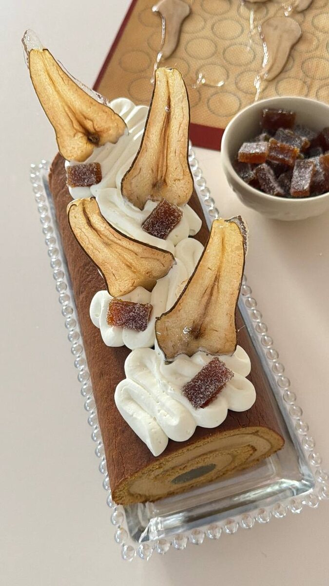 ! Сколько здесь разных вкусов и текстур переплелось: 🧡взбитый ванильный ганаш 🧡грушевый мармелад 🧡карамельные слайсы груши 🧡медовый бисквит с медом, сухой карамелью и сахаром мусковадо 🧡медово грушевая пропитка 🧡крем со сгущеной сметаной 🧡грушевый центр Пробу я сняла. Он пропитался, настоялся, все вкусы объединились в единый. Просто поверьте - это волшебно! На классический торт медовик совсем не похож! 🍐🍯🍐🍐🍐🍯🍯🍯 #бисквитныйрулет #медовыйрулет