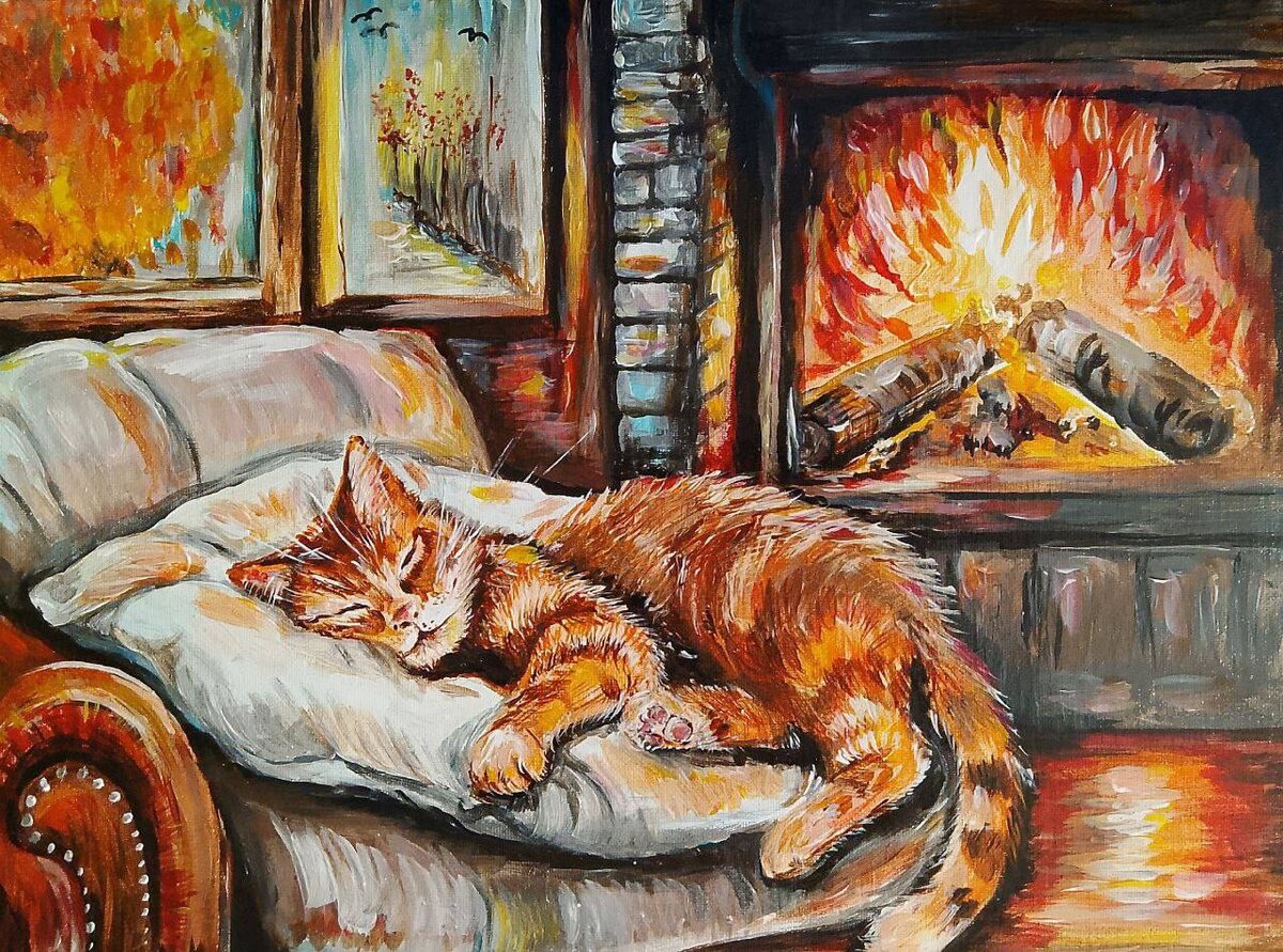 теплых, уютных сценах повседневной жизни, часто с животными, интерьерами и мягким освещением. Художница избегает резких контрастов, предпочитая мягкие переходы тонов и детальную проработку деталей, таких как шерсть котов или складки тканей, что создает атмосферу домашнего уюта и ностальгии. Работает преимущественно акриловыми красками на холсте, покрывая работы лаком для защиты и насыщенности цвета. Эта техника позволяет тщательно моделировать объемы и фактуры, сочетая точность с эмоциональной свободой мазка.