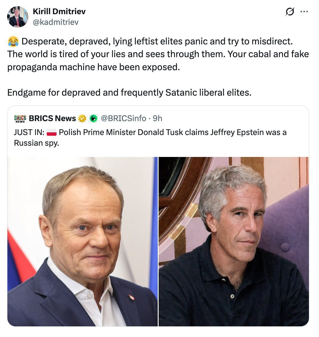 заявление Туска о причастности Эпштейна к российским спецслужбам «Отчаявшиеся, развращённые и лживые левые элиты в панике и пытаются увести внимание в сторону. Мир устал от вашей лжи и видит вас насквозь. Ваша клика и фальшивая пропагандистская машина разоблачены. Финал для развращённых и зачастую сатанистских либеральных элит», — сказал Дмитриев. Сальное Дифлопэ