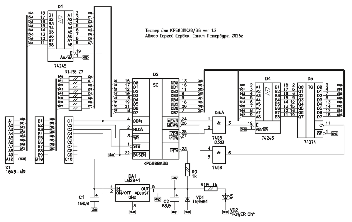 Всех приветствую! Все тестирующие устройства рассчитаны на массовую проверку, когда в загашниках лежат целые коробки комплектующих, плюс не всегда есть возможность проверить сложную микросхему в работающем экземпляре компьютера. Одна из таких микросхем - это КР580ВК28(38). Это шинный формирователь и системный контроллер, разделяющий работу команд микропроцессора LDA/STA и IN/OUT, а также способный заставить процессор КР580ВМ80А выполнить прерывание и выдать при этом сигнал подтверждения прерывания /INTA для управления, например, контроллером прерываний КР580ВН59. Одним словом - весьма полезная микросхема. Так вот данный тестер, подключающийся к компьютеру Орион-128, способен проверить данную микросхему на работоспособность, эмулируя работу микропроцессорной системы, с которой бы могла работать КР580ВК28(38) (далее по тексту - ВК28). Схема тестера приведена ниже: Тестер подключается к Ориону через порт пользователя /F600 разъёмом Х1. Один канал порта (канал А) настраивается на вывод, вт