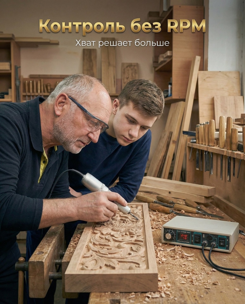 Если кажется, что инструмент «нервный», не спеши менять обороты. Попробуй: 🔹 приблизить пальцы к патрону, 🔹 дать опору мизинцу или ладони, 🔹 замедлить подвод к линии. Часто контроль теряется не из-за скорости, а из-за хвата и дистанции. Меньше изменений — больше стабильности.