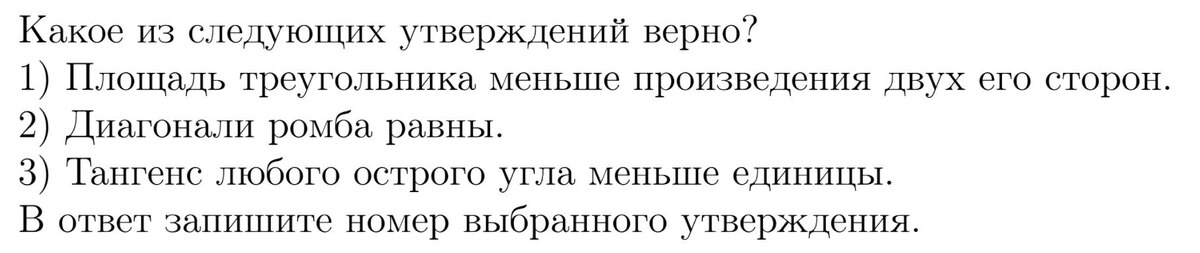 1. Площадь треугольника меньше произведения двух его сторон — верно. Площадь треугольника равна половине произведения двух его сторон на синус угла между ними. Поскольку синус угла всегда меньше или равен 1, площадь треугольника всегда меньше или равна половине произведения двух его сторон, что меньше произведения двух сторон. 2. Диагонали ромба равны — неверно. Диагонали ромба равны только в том случае, если ромб — квадрат. 3. Тангенс любого острого угла меньше единицы — неверно. Тангенс острого угла может быть как меньше, так и больше единицы, в зависимости от величины угла. Например, тангенс угла 45 градусов равен 1, а тангенс угла 60 градусов больше 1.