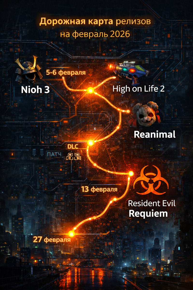 Дорожная карта релизов на февраль — редкий случай, когда календарь выглядит не как набор дат, а как маршрут с обязательными остановками. Причём остановки разные по жанрам и настроению, но одинаково «громкие»: Nioh 3 открывает месяц лезвием катаны, High on Life 2 и Reanimal устраивают пятничный (буквально) двойной удар, а Resident Evil Requiem ставит финальную печать — возвращением туда, откуда у многих началась любовь к хоррору.
