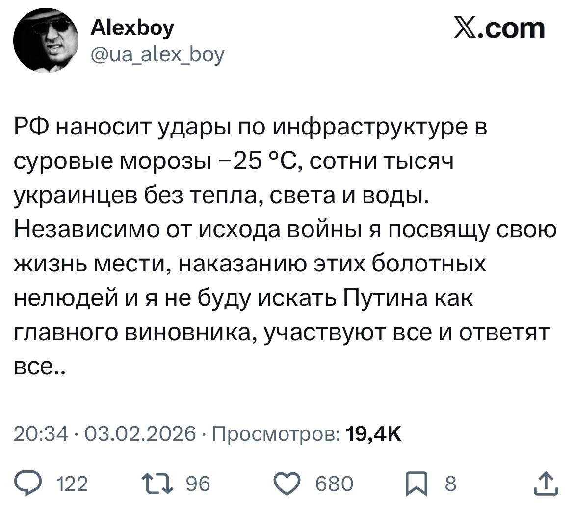 Если кого то и стоит винить в отсутствии света, тепла и воды, так это действующий укрорежим. 🤔 Я что-то не припомню, чтобы киевская хунта при ударах по Донецку делала скидку на погоду. Про воду я молчу. Что касается "боротьбы", то ближайший пункт комплектования примет с распростертыми объятьями такого мстителя. Или он только в запрещенке всех наказывать собрался?? 🌐 ТГ | 🇷🇺 MAX