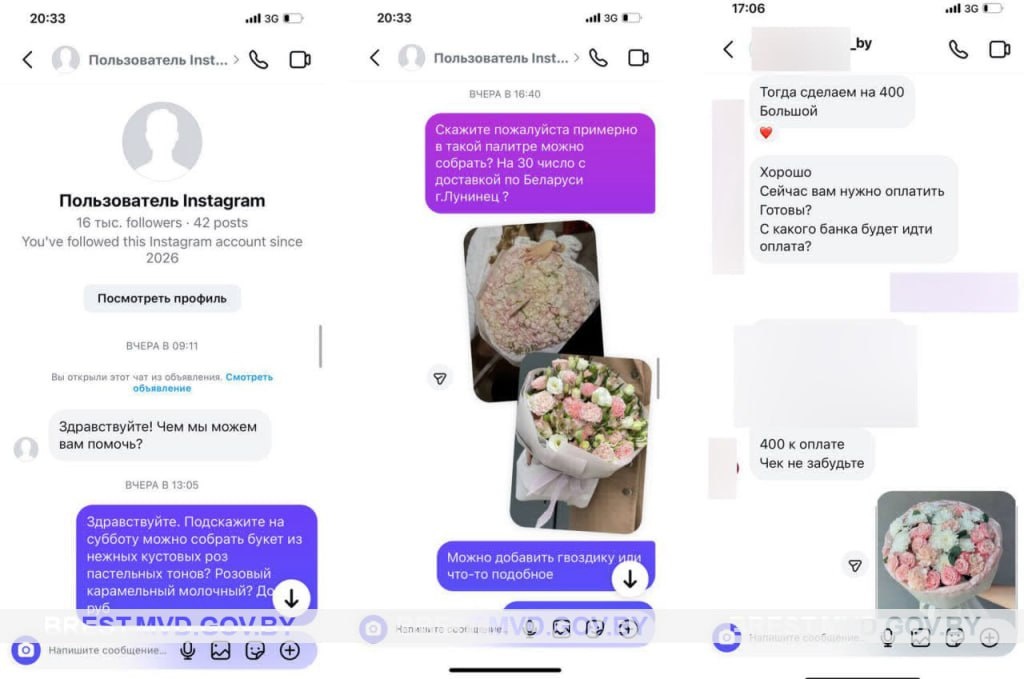 #Милиция_Брестчины #Мошенничество 📞В Московское РУВД г. Бреста обратился 28-летний житель города с заявлением о хищении денежных средств. 🗣Мужчина пояснил, что решил заказать для девушки букет цветов 💐и нашел в Инстаграм соответствующий магазин. В ходе переписки с «менеджером» в Телеграм все детали заказа были согласованы. После оплаты букета покупатель уточнил возможность доставки по указанному адресу. Для оформления доставки «продавец» прислал ссылку и попросил заполнить форму, куда входили и данные банковской карты. ⛔️Как только гражданин ввел реквизиты, с его карты моментально было списано 140 рублей. После этого «менеджер» перестал выходить на связь. ☝️В похожей ситуации оказался житель Лунинца, которого также обманули в Инстаграм при покупке цветов 🌷 ✍🏻25-летний мужчина решил порадовать любимую женщину, но результат получился довольно неприятным. ➡️ПОДРОБНЕЕ: НОВОСТИ УВД 🔵Крепость
