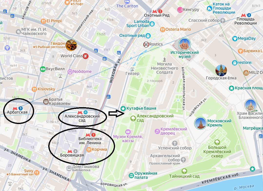 Ближе всего расположена станция метро «Александровский сад» голубая ветка № 4, чуть дальше «Боровицкая» серая ветка № 9., «Библиотека им.Ленина» красная ветка № 1., «Арбатская» синяя ветка № 3.