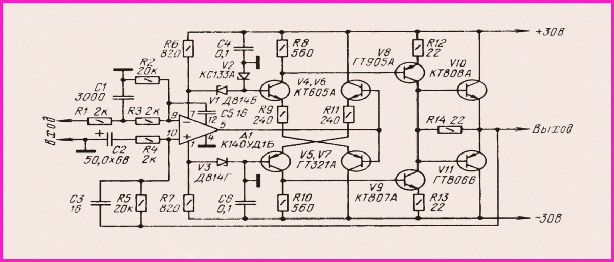 Термостабильный усилитель низкой частоты мощностью 30 Вт на нагрузке 8 Ом