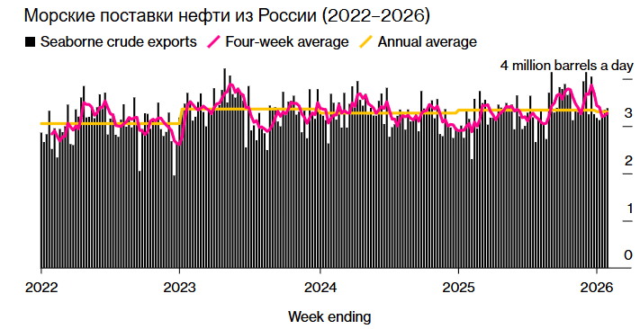 Bloomberg кажется немного опечаленным: "Поставки российской нефти остаются стабильными, несмотря на усиливающееся давление на важнейшую для страны отрасль". Но агентство тут же находит повод для оптимизма: "За четыре недели до 1 февраля Россия экспортировала 3,27 млн баррелей нефти в день, но, возможно, она вот-вот потеряет ключевой рынок сбыта в Индии".