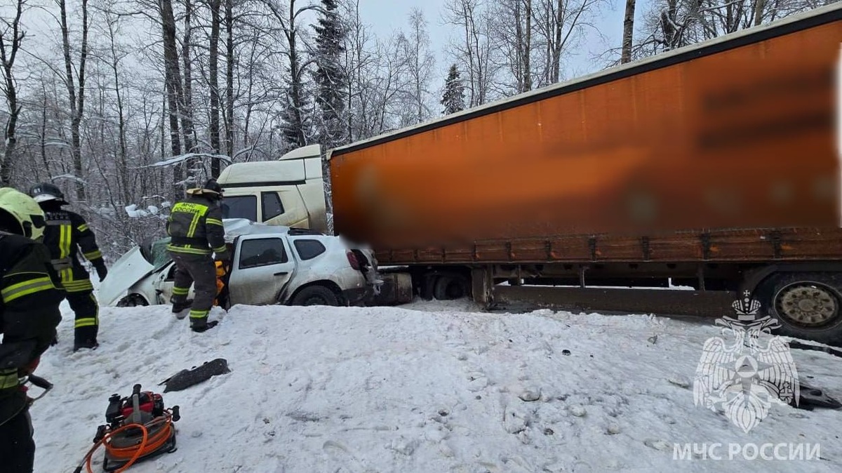 На федеральной трассе произошло смертельное дорожно-транспортное происшествие. Четвертого февраля около половины одиннадцатого утра на 433-м километре автодороги «Вологда-Тихвин-Р21 «Кола»» в сторону Новой Ладоги столкнулись три автомобиля. По предварительным данным, авария произошла в момент обгона. Легковой автомобиль «Рено Дастер» двигался из Тихвина в сторону Новой Ладоги. При выполнении маневра машина выехала на полосу встречного движения. Именно на встречке и произошло первое столкновение. «Рено» столкнулся лоб в лоб с грузовым автомобилем «ФАВ», который двигался навстречу. От удара грузовик изменил траекторию и врезался в другой грузовой автомобиль - «ДАФ», следовавший в том же направлении. В результате этого происшествия водитель «Рено Дастер», мужчина 46 лет, получил тяжелые травмы, несовместимые с жизнью. Он скончался на месте до приезда медиков. Сотрудники ГИБДД и следователи проводят проверку, чтобы установить все детали и причины случившегося. Фото: ГУ МЧС России по