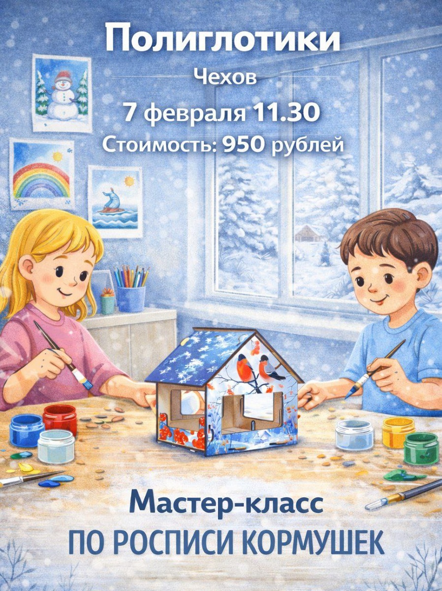 ✨ Мастер-класс по росписи кормушек Друзья, зима — самое сложное время для пернатых, и даже маленький добрый поступок может помочь им пережить холода. Приглашаем детей от 5 лет на мастер-класс по росписи кормушек — творческое занятие, которое учит заботе о природе и вниманию к окружающему миру. Мы вместе: 🎨 распишем кормушку 🌿 поговорим о пользе помощи птицам 💛 сделаем важное доброе дело своими руками Предварительная запись обязательна❗ 📆 07.02.2026 🕛 11:30 🏢 Языковой образовательный центр "ПОЛИГЛОТИКИ" 📍 г. Чехов, ул. Уездная, д. 2 🔗 Напишите нам: @poliglotikichekhov 🌟Соц.сети: 🔥https://vk.com/poliglotikichekhov 🔥https://dzen.ru/id/65d5ffd4021a5d4953ccf615 ⭐Поддержать канал голосом ✅ Мероприятия Чехов https://dzen.ru/id/66cc4b48e9ef144699238a51 http://vk.com/chekhov_events http://dzen.ru/chekhov_events