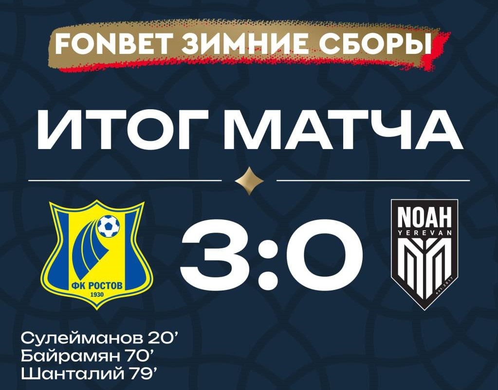 Сегодня в Абу-Даби прошла очередная товарищеская встреча. Напомним, в первой встрече 17 января наши разгромили китайцев со счётом 3:0. 14 января играли с «Локо» - и Николай Комличенко лишил ростовчан победы. А 1 февраля ростовчане не смогли одолеть «Родину». Сегодня играли с армянским клубом «Ноа». Это профессиональный футбольный клуб, базирующийся в Ереване. Был создан в 2017 году под названием «Арцах», впоследствии сменил владельца и название на «Ноа». В 2024 году команда квалифицировалась в общем этапе Лиги конференций УЕФА, обыграв «Ружомберок», став первым клубом в истории Лиги конференций, успешно прошедшим все четыре раунда квалификации. В сезоне 2024/25 команда впервые стала чемпионом Армении, а также во второй раз завоевала кубок страны. «Ноа» в сезоне 2025/26 стал первым армянским клубом, который второй год подряд вышел в основной этап европейского клубного турнира. Заняв 19-е место, стал первым армянским клубом, который вышел в плей-офф еврокубка. Ну, а сегодня наши обыграли